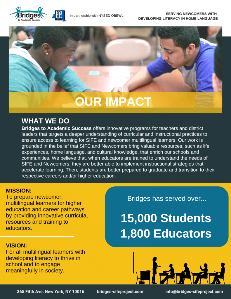 Bridges to Academic Success offers innovative programs for teachers and district leaders that targets a deeper understanding of curricular and instructional practices to ensure access to learning for SIFE and newcomer multilingual learners. Our work is grounded in the belief that SIFE and Newcomers bring valuable resources, such as life experiences, home language, and cultural knowledge, that enrich our schools and communities.